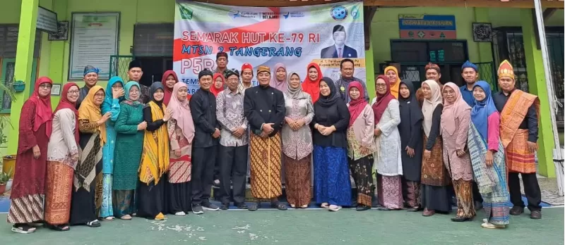 Tampak berbeda dari biasanya, dewan guru MTsN 2 Tangerang mengikuti upacara dengan mengenakan pakaian adat daerah. Kepala Madrasah, Trisno Ferdiansyah, M.Pd., mengenakan pakaian adat beskap khas Jawa Tengah. Sementara itu, Pak A. Hanapiyah, M.Pd., yang bertindak sebagai pembina Upacara, memakai pakaian adat Baduy. Beberap guru juga tampak memakai pakaian dari berbagai daerh di Indonesia: Ibu Rina Susanti yang mengenakan pakaian adat NTB, Pak Fajar mengenakan kain ulos khas Batak, Bu Kokom yang mengenakan baju adat Betawi, serta bapak-ibu guru lain yang mengenakan batik dan kebaya dari bermacam daerah. (FT)